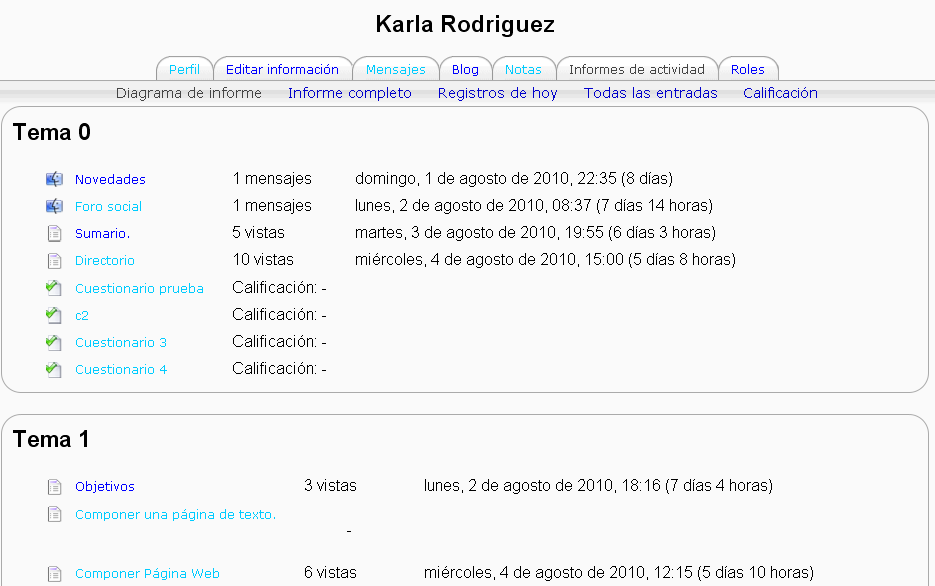 En la lista de participantes, accesible desde el panel Personas, enlace Participantes, disponemos de enlaces al informe de actividades de cada alumno. La herramienta TecnoLearning lleva un registro completo de todas las actividades del usuario en la plataforma: todos los recursos que ha leído, cuantas veces los ha visitado y cuando, que actividades ha completado y cuáles no, que calificación a obtenido en cada una, los cuestionarios que ha completado, todos los mensajes que ha mandado a foros, entradas de diarios y de glosarios… Ya adelantábamos en la Figura 92 una visión del trabajo de un alumno ficticio.