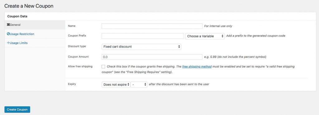 - Ingrese un Prefijo de Cupón o Elija una Variable del menú desplegable para agregar al código del cupón. Le permite personalizar el cupón para los clientes generando automáticamente el prefijo o puede crear el suyo propio.