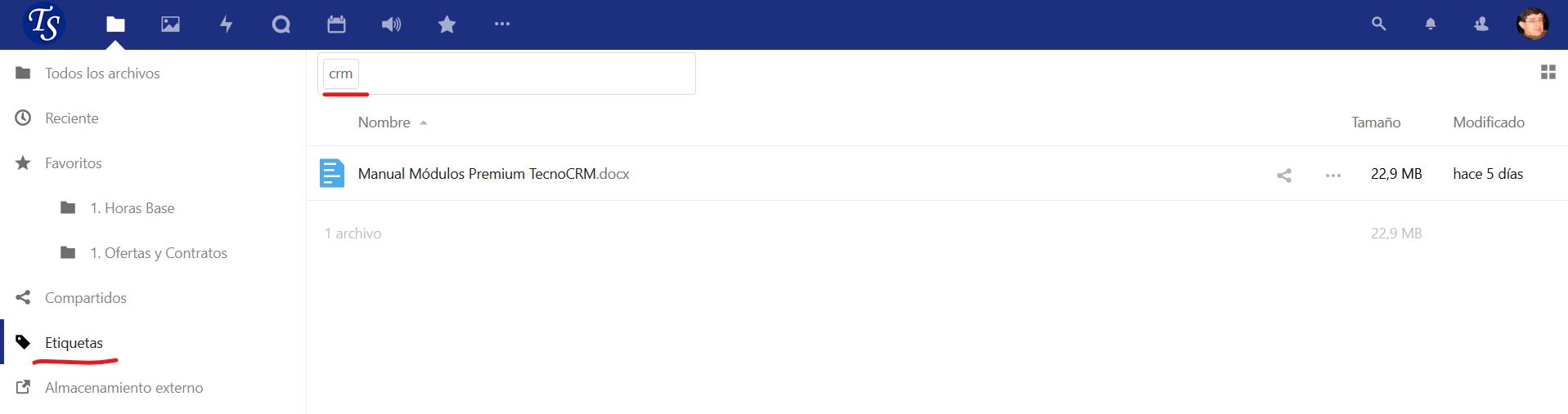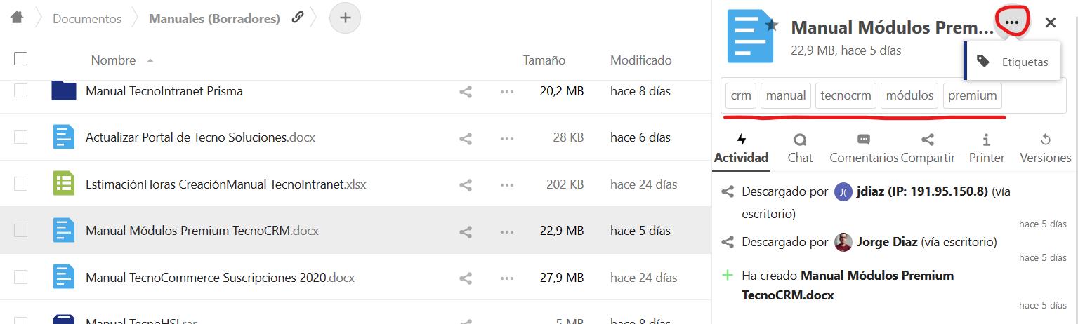 Puede asignar etiquetas a los archivos. Para crear etiquetas, abra un archivo en la vista Detalles. Luego escribe tus etiquetas. Para ingresar más de una etiqueta, presione la tecla de retorno después de crear cada etiqueta. Todas las etiquetas son etiquetas del sistema y son compartidas por todos los usuarios en su servidor TecnoCloud.