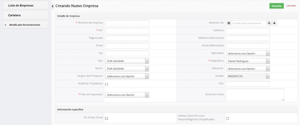 Finalmente haga clic en el botón [Guardar] para transferir la información a la base de datos de TecnoCRM