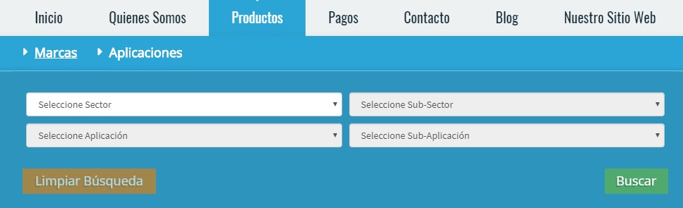 Además de mostrar los diferentes enlaces asociadas a las páginas de contenido y funcionalidades del portal, nos muestra a través de la opción ‘Productos’ las opciones de: ‘Marcas y Aplicaciones’. Las marcas se muestran tipo ‘transición de imágenes’, mientras que, para las aplicaciones, podremos realizar una búsqueda avanzada de productos según un sector determinado.