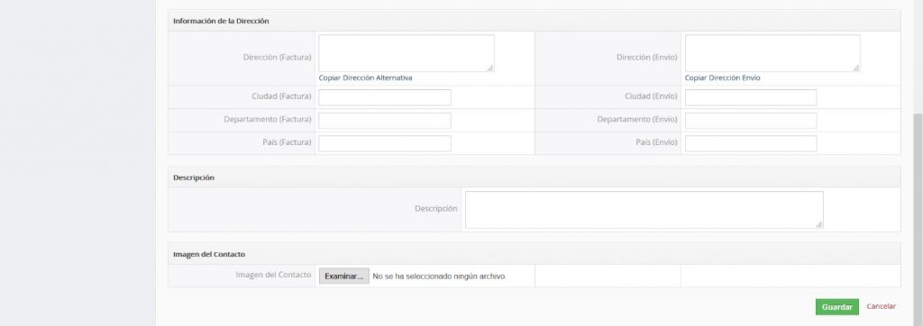 Imagen del Contacto: Si está disponible, usted puede cargar una imagen del contacto al CRM. Por favor note que esta imagen debe estar en formato png, jpg o gif. A su vez, debe observar que esta imagen también será mostrada como icono en la vista de listado de contactos.