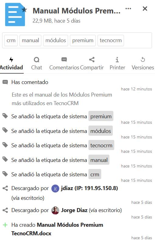 La vista Detalles muestra información sobre actividades, uso compartido y versiones.