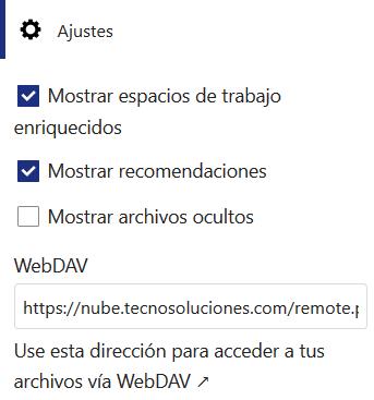 El icono de engranaje de Ajustes en la parte inferior izquierda le permite mostrar u ocultar archivos ocultos en su interfaz web de TecnoCloud. Estos también se denominan archivos de puntos, porque tienen el prefijo de un punto, por ejemplo .mailfile. El punto le dice a su sistema operativo que oculte estos archivos en sus exploradores de archivos, a menos que elija mostrarlos. Por lo general, estos son archivos de configuración, por lo que tener la opción de ocultarlos reduce el desorden.