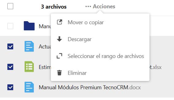 Cuando selecciona varios archivos, puede eliminarlos todos, moverlos, copiarlos o descargarlos como un archivo ZIP utilizando el botón de […Acciones] que le mostrará las diversas opciones posibles: