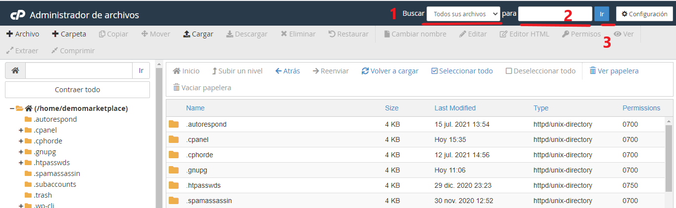 El cuadro de texto Buscar en la esquina superior derecha de la interfaz permite a los usuarios buscar un archivo específico. De forma predeterminada, el cuadro de texto Buscar busca todos los archivos en la carpeta de inicio. Puede limitar la búsqueda a la raíz del documento en /home/user/public_html, donde userrepresenta su nombre de usuario de cPanel. También puede limitar la búsqueda a la carpeta en la interfaz.