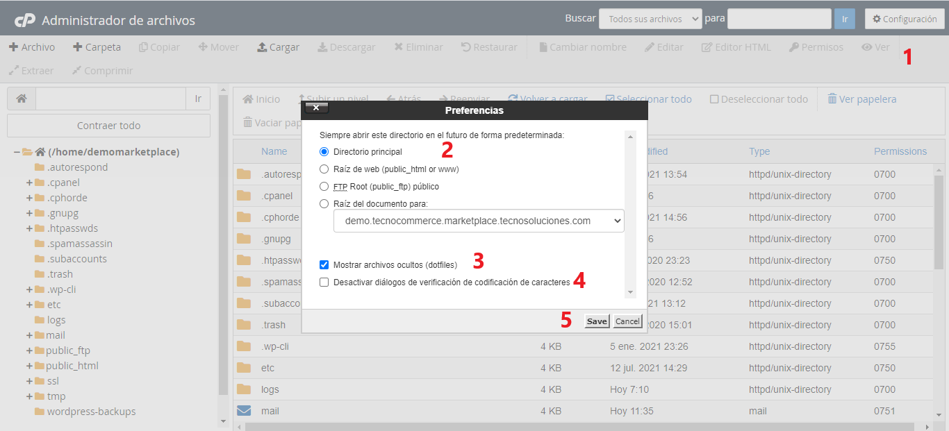 Para mostrar archivos ocultos en la interfaz, seleccione Mostrar archivos ocultos (dotfiles) .