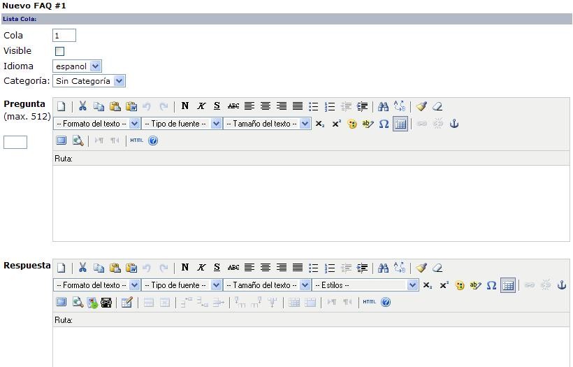 Para crear una pregunta con su respuesta, se debe hacer click en “Nuevo FAQ” y llenar el formulario. Es importante destacar que se pueden agregar imágenes, incluir la fecha, estatus, respuestas cortas y respuestas largas, además el sistema cuenta con un amigable editor en línea, donde es posible definir tipos y tamaños de letras, tablas, colores del texto, enlaces, entre otros. Parte de este formulario se muestra a continuación: