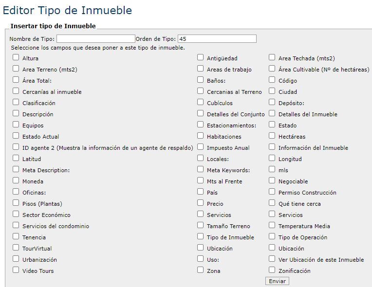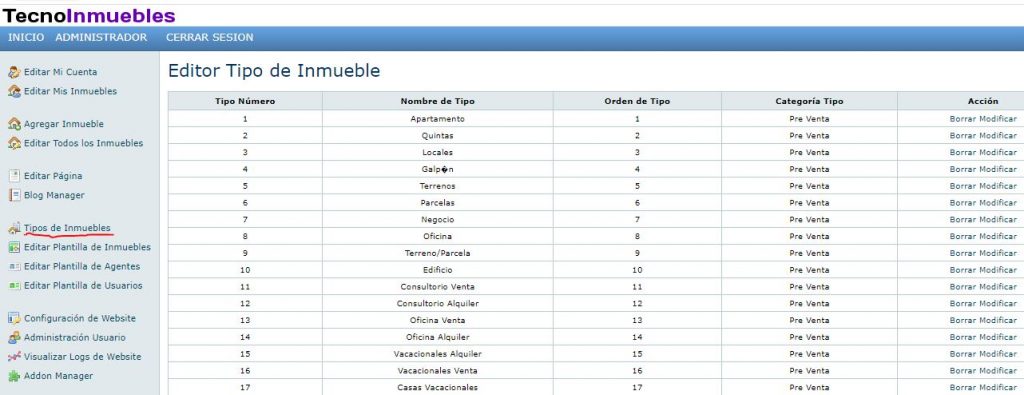Permite configurar (editar / crear / borrar) los nombres de los diversos tipos de inmuebles que se comercializan en el portal. Inicialmente, muestra el listado de los tipos de propiedades ya configuradas con el Topo Número, Nombre del Tipo, Orden de Tipo, Categoría Tipo, y la Acción para: borrar / editar.