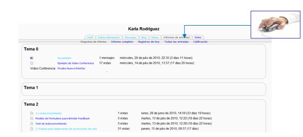 Esta ficha sólo aparece cuando hemos iniciado una sesión como profesor o administrador. Permite acceder al informe de actividad del usuario seleccionado.