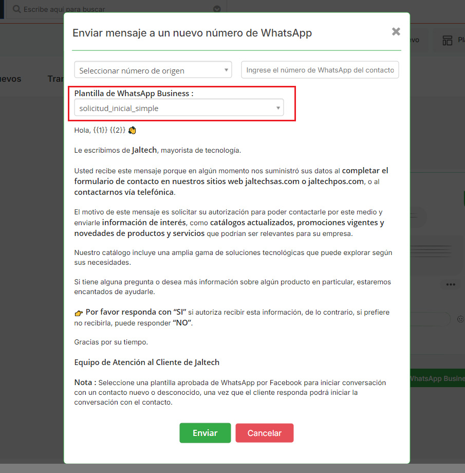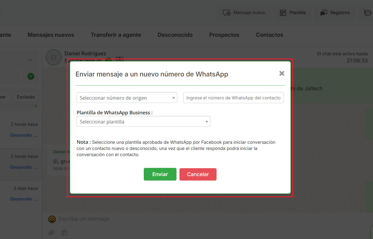 El usuario debe seleccionar la plantilla de WhatsApp Business para iniciar la conversación.