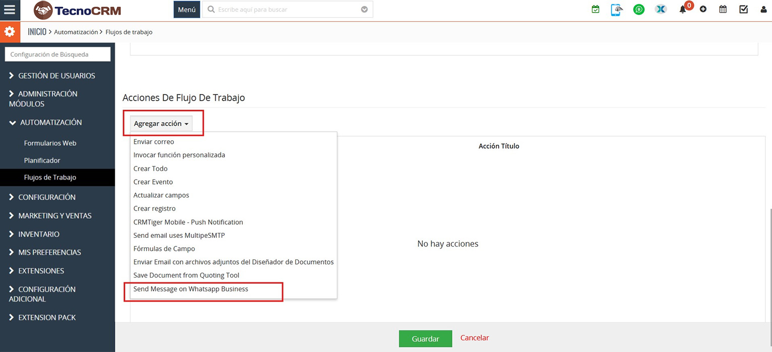 Una vez en la sección de flujos de trabajo, al añadir uno nuevo o editar otro existente, baje hasta llegar al apartado Acciones de Flujos de Trabajo > Agregar Acción > Send Message On WhatsApp Business