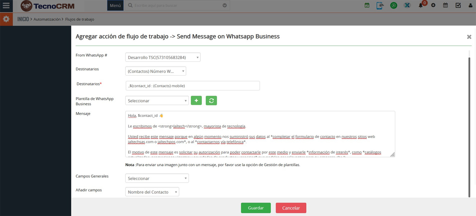 El flujo de trabajo de WhatsApp Business puede configurar los mensajes de WhatsApp Business a quienes queremos enviar de forma individual, plantillas de WhatsApp Business para compartir archivos o formato de mensaje, campo general, agregar campos y mensaje.