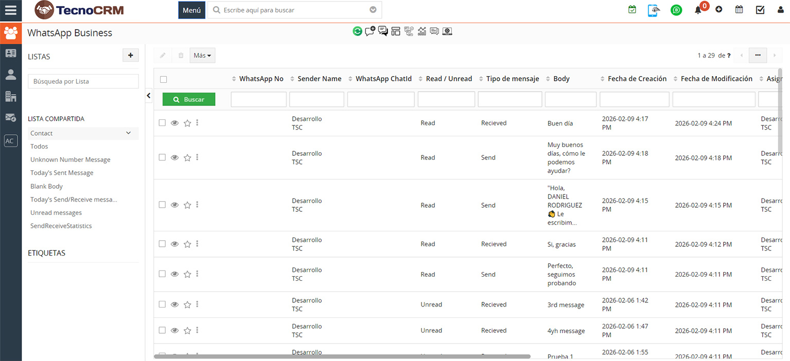 Al hacer clic en esta opción del Menu de Acciones Rápidas, será redirigido a la interfaz de Mensajes de WhatsApp Business, que muestra el historial completo de conversaciones con cada cliente, incluyendo todos los mensajes enviados y recibidos, junto con los datos correspondientes de solicitudes y respuestas a la API. Esto proporciona transparencia y trazabilidad a los equipos de soporte, desarrollo y cumplimiento.