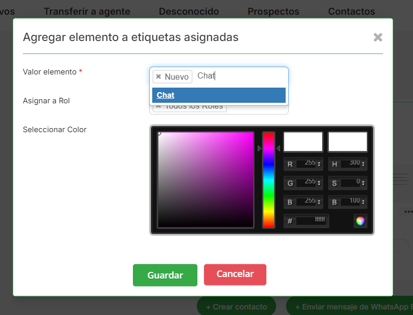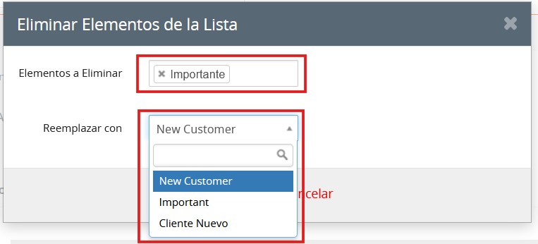 Al hacer clic en “Eliminar”, aparecerá una ventana emergente donde el usuario deberá reemplazar la etiqueta existente por otra. Esto garantiza que todos los chats asociados con la etiqueta eliminada se reasignen a la nueva etiqueta.