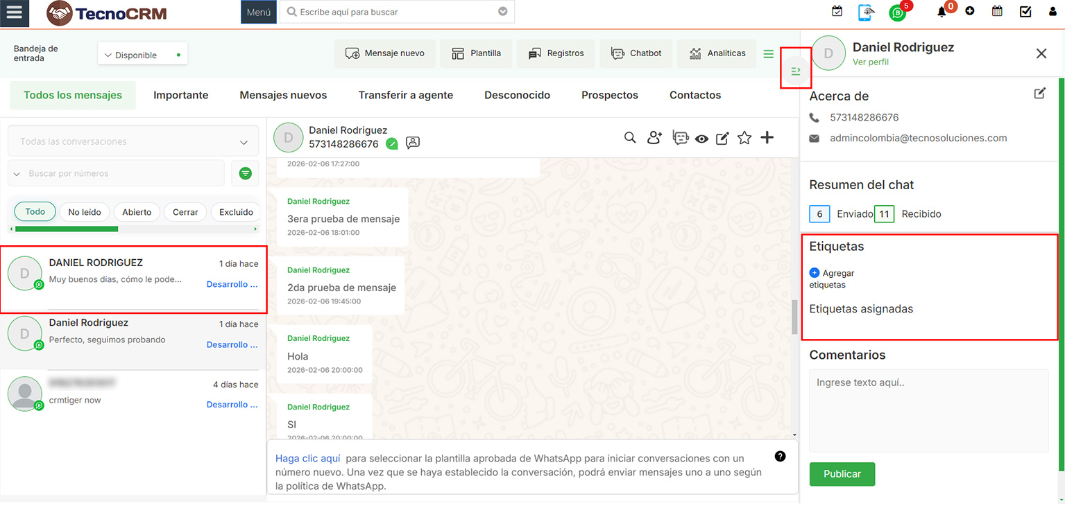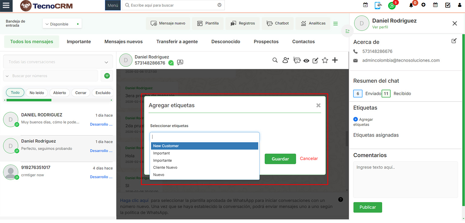 Tras añadir una etiqueta, el usuario puede aplicarla haciendo clic en el usuario, deplegando los detalles del contacto mediante el botón ubicado en el borde superior derecho, luego en el apartado Etiquetas > “Añadir etiqueta”.