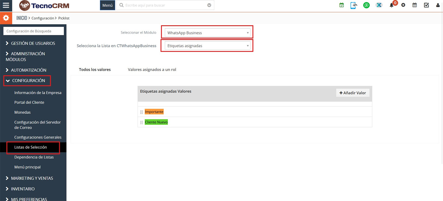 Para editar o eliminar cualquier etiqueta, vaya a Configuración > Configuración de CRM > Configuración > Valores de campo de lista de selección. La siguiente pantalla será visible. Seleccione en los campos Module: WhatsApp Business / Picklist: Allocated Labels.
