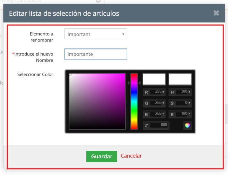 Al hacer clic en “Editar”, se abrirá la pantalla siguiente desde donde el usuario podrá cambiar el nombre y el color de la etiqueta.