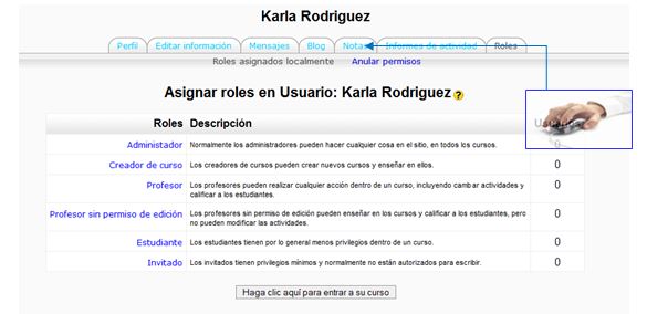 Aunque trataremos este tema en un capítulo aparte, basta saber por ahora que un rol es un identificador del estatus del usuario en un contexto particular. Es decir, qué privilegios o qué habilidades, capacidades o acciones puede realizar ese usuario (por ejemplo, ver todos los blog de usuario, leer registros de chat, eliminar mensajes propios de los foros, participar en un taller, editar páginas wiki, etc.). Profesor, Estudiante o Administrador son ejemplo de roles.