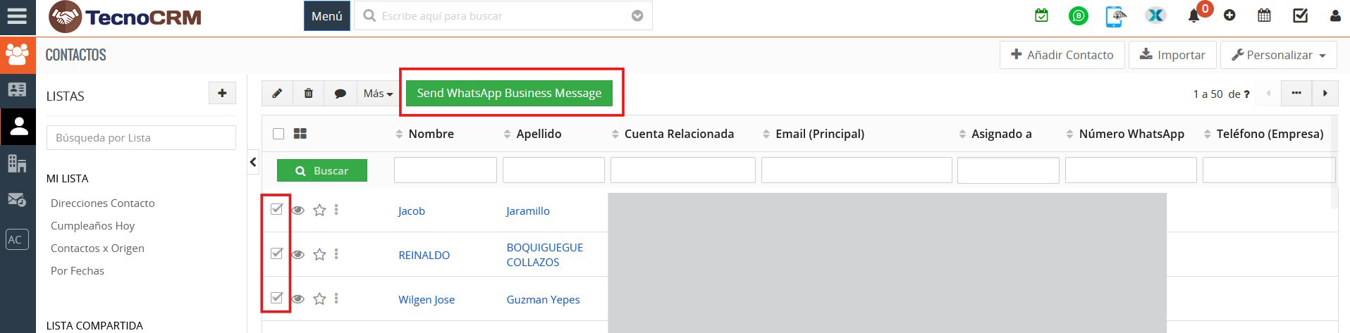 Desde la lista de registros, seleccione varios registros, luego vaya a “Enviar mensaje de WhatsApp Business” para enviar mensajes masivos de WhatsApp a varios contactos.