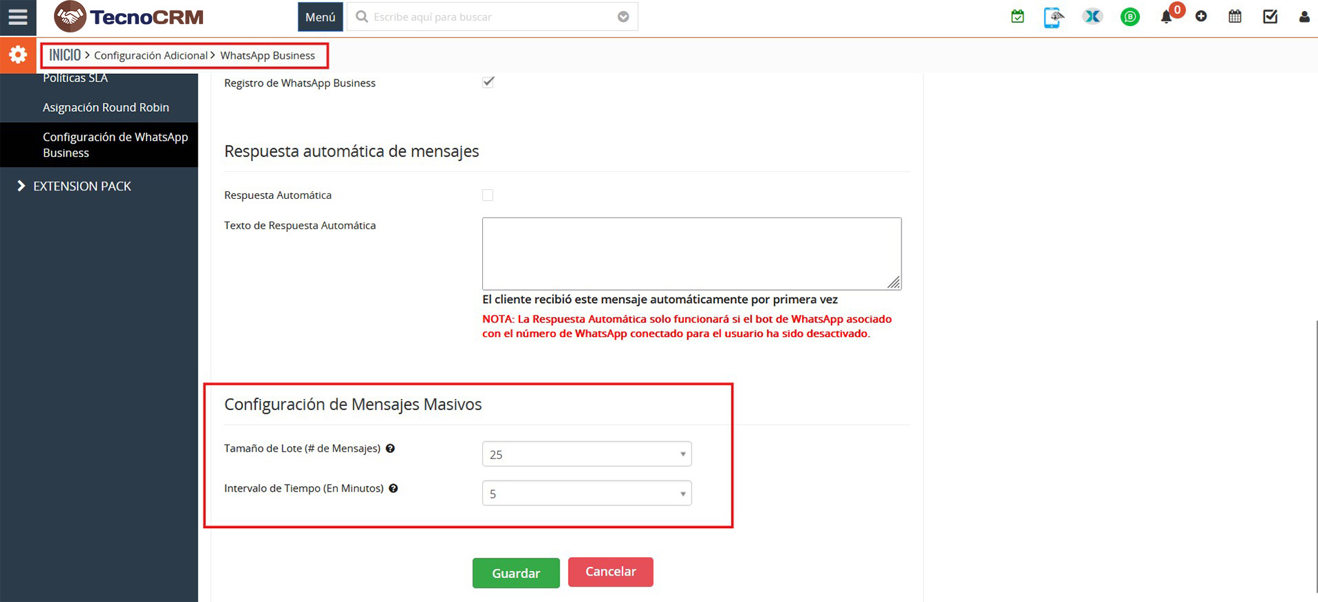 Administrar mensajes masivos desde Otros ajustes > Configuración de WhatsApp > Icono de engranaje > buscar Configuración de mensajes masivos. Visite el tema “1.6 Configuración de mensajes masivos” para más información.