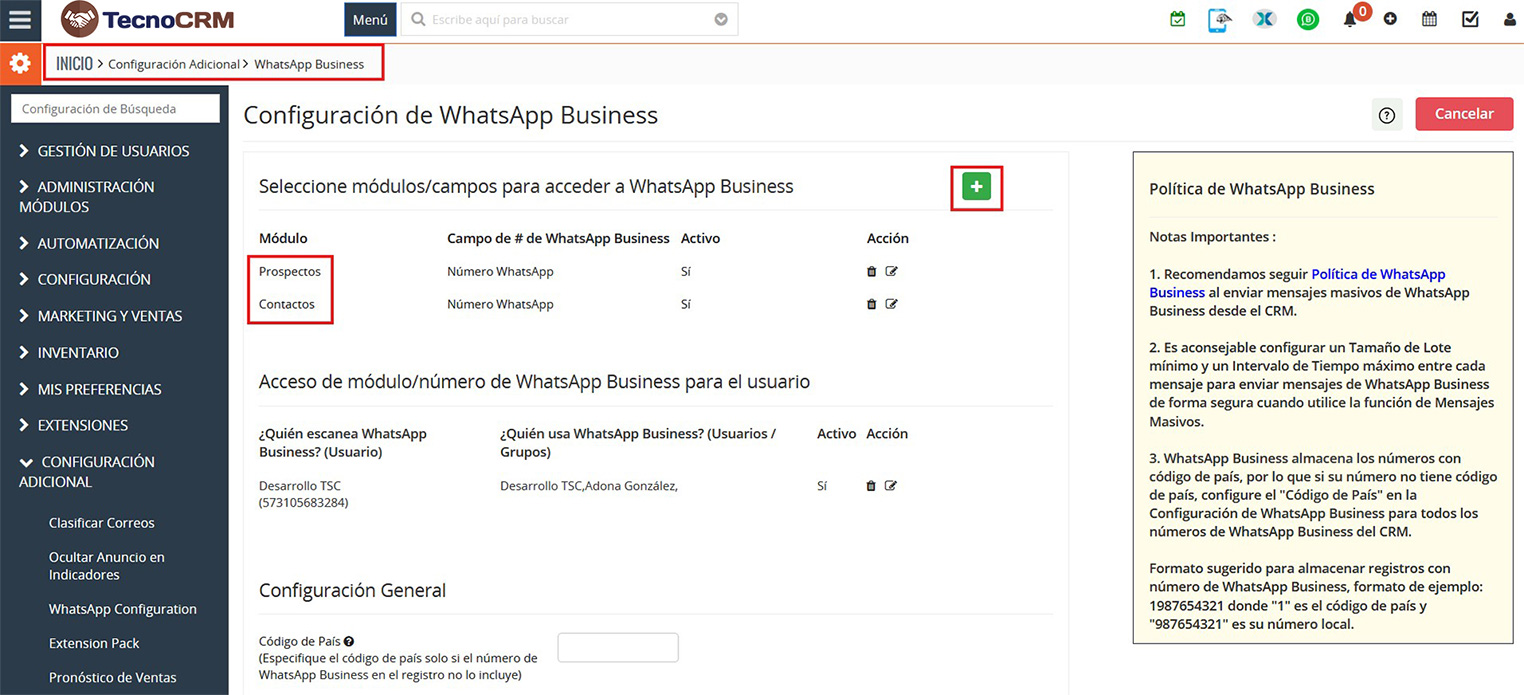 Los usuarios pueden enviar mensajes masivos desde la lista de registros de CRM para aquellos módulos que estén habilitados desde la función “Permitir acceso al módulo” desde la página de configuración de WhatsApp.