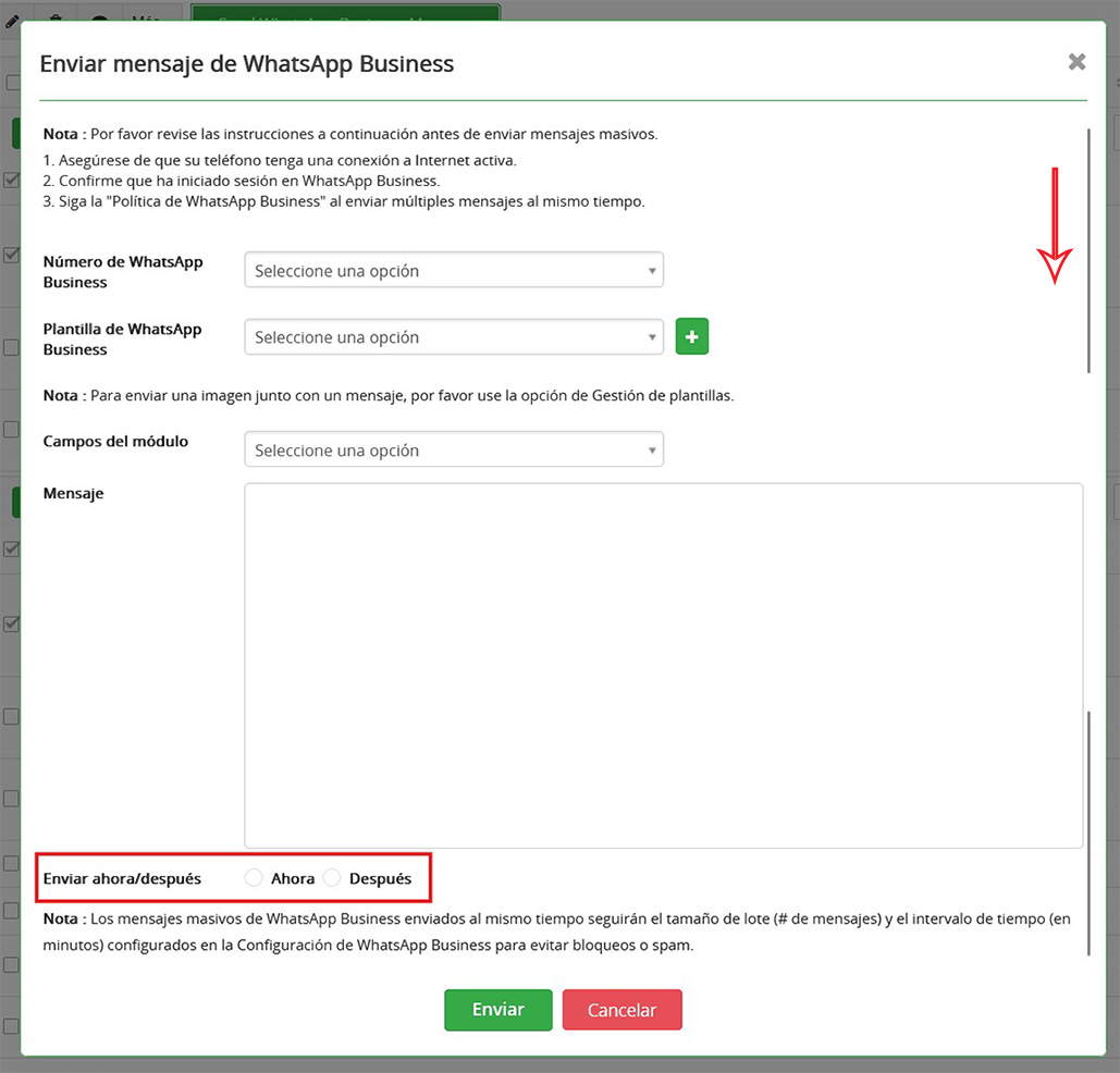 Los usuarios pueden enviar mensajes masivos inmediatamente o programarlos para una fecha posterior seleccionando la hora deseada en la opción “Enviar ahora/más tarde”.