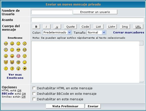 - El texto o Cuerpo del Mensaje, que puede estar apoyado por emoticons (iconos emocionales) y una ayuda para dar formato al texto en HTML, añadir enlaces, palabras remarcadas, listas / viñetas, etc.