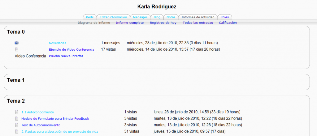 Esta ficha sólo aparece cuando hemos iniciado una sesión como profesor o administrador. Permite acceder al informe de actividad del usuario seleccionado.