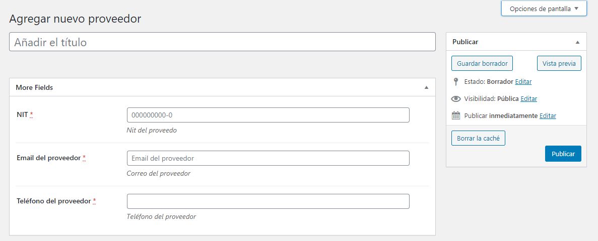 Al darle clic al botón, aparecen todos los campos correspondientes a la información del proveedor. Solamente debemos llenar los campos con los datos correspondiente y luego darle clic al botón de guardar.