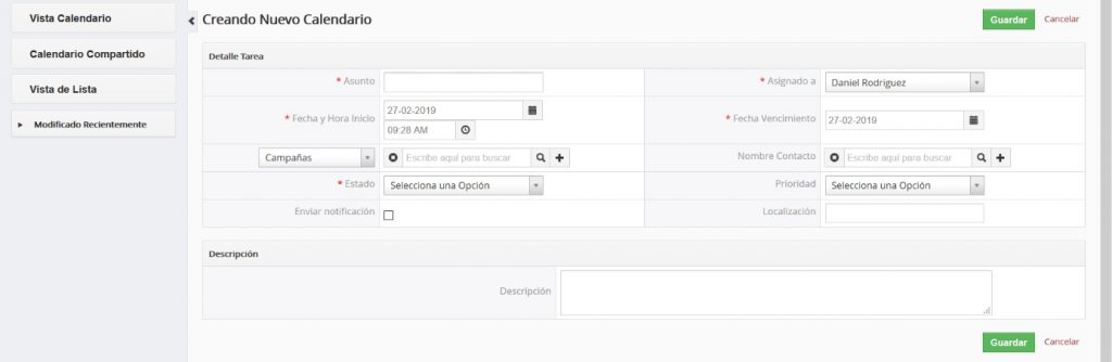 Al finalizar de crear la tarea debe hacer clic en el botón [Guardar] para pasar la información a TecnoCRM