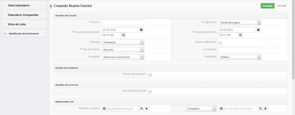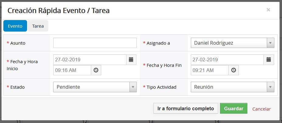 Tipo de Actividad/Evento: Seleccionar el tipo de actividad (Ej, Llamada, Reunión, etc.).