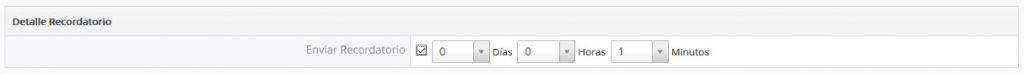 Usted puede hacer clic en la casilla [Enviar Recordatorio] para programar el envío de un email automático de recordatorio por TecnoCRM. Para el mensaje del recordatorio debe introducir el tiempo de antelación con el cual se enviará el mismo.