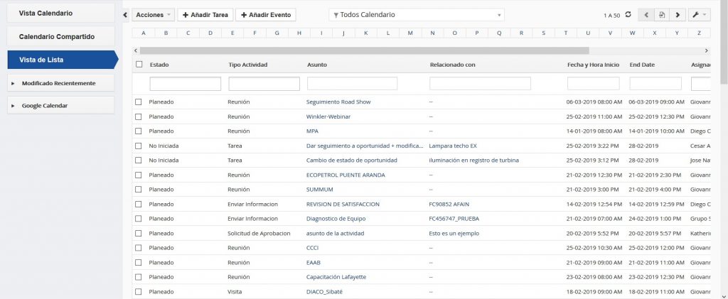 Si usted quiere ver todas las actividades en una lista puede hacer clic en la pestaña [Vista de Lista] en el área del calendario.