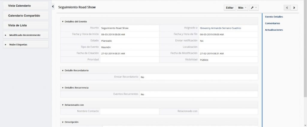 En esta vista puede cambiar los detalles de tareas existentes, editando, duplicar actividades, entre otros.