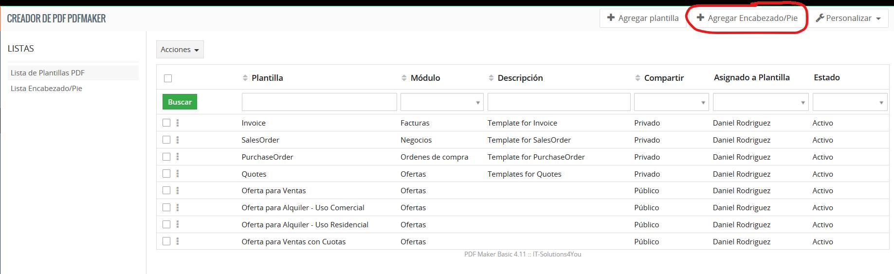 La siguiente captura de pantalla le muestra la Vista de Lista del Creador de PDF. Puede hacer clic en el botón para agregar una nueva plantilla de encabezado/pie de página: