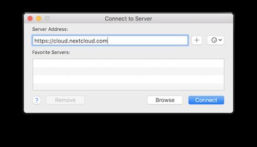 Nota: MacOS Finder sufre una serie de problemas de implementación y solo debe usarse si el servidor TecnoCloud se ejecuta en Apache y mod_php, o Nginx 1.3.8+. Los clientes alternativos compatibles con macOS capaces de acceder a recursos compartidos de WebDAV incluyen aplicaciones de código abierto como Cyberduck (consulte las instrucciones aquí ) y Filezilla. Los clientes comerciales incluyen Mountain Duck, Forklift, Transmit y Commander One.