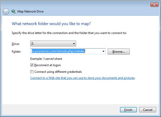 Nota: Para los servidores protegidos con SSL, marque Reconectar al iniciar sesión para asegurarse de que la asignación sea persistente en los reinicios posteriores. Si desea conectarse al servidor de TecnoCloud como un usuario diferente, marque Conectar con diferentes credenciales.