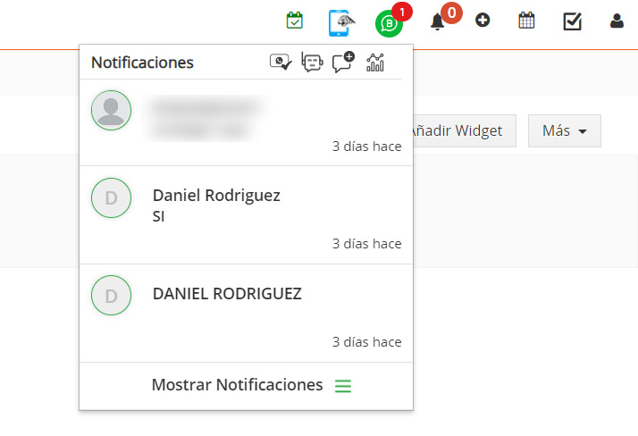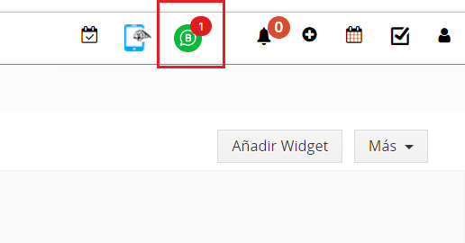 Ubique el icono de WhatsApp Business en la parte superior derecha de la interfaz de TecnoCRM. Aquí podemos ver el recuento de mensajes nuevos cuando llega un nuevo mensaje.