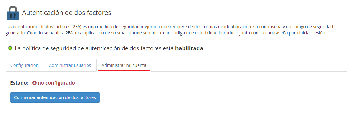 La pestaña Administrar mi cuenta le permite configurar 2FA para la cuenta raíz o una cuenta de revendedor.