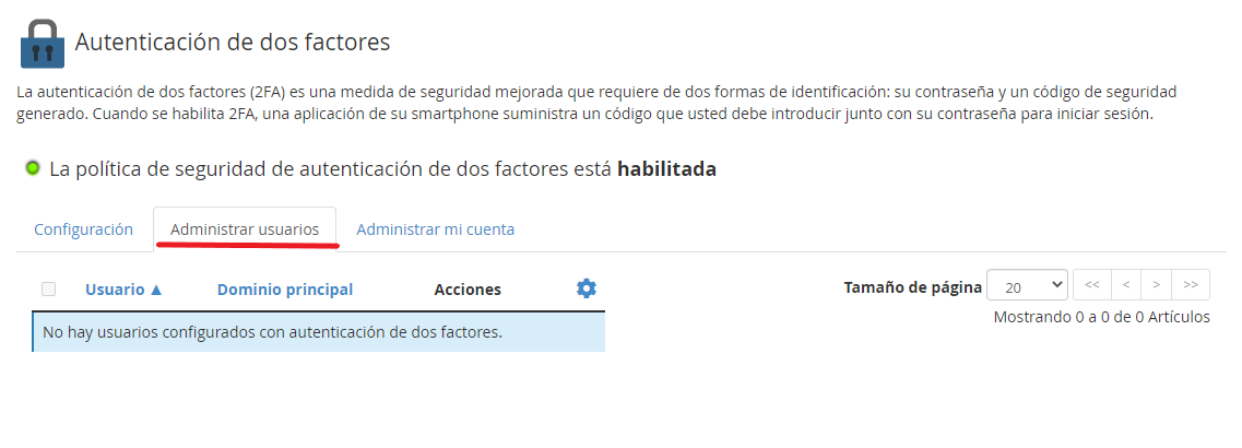 La pestaña Administrar usuarios muestra las cuentas para las que ha configurado 2FA. También le permite deshabilitar 2FA en esas cuentas.