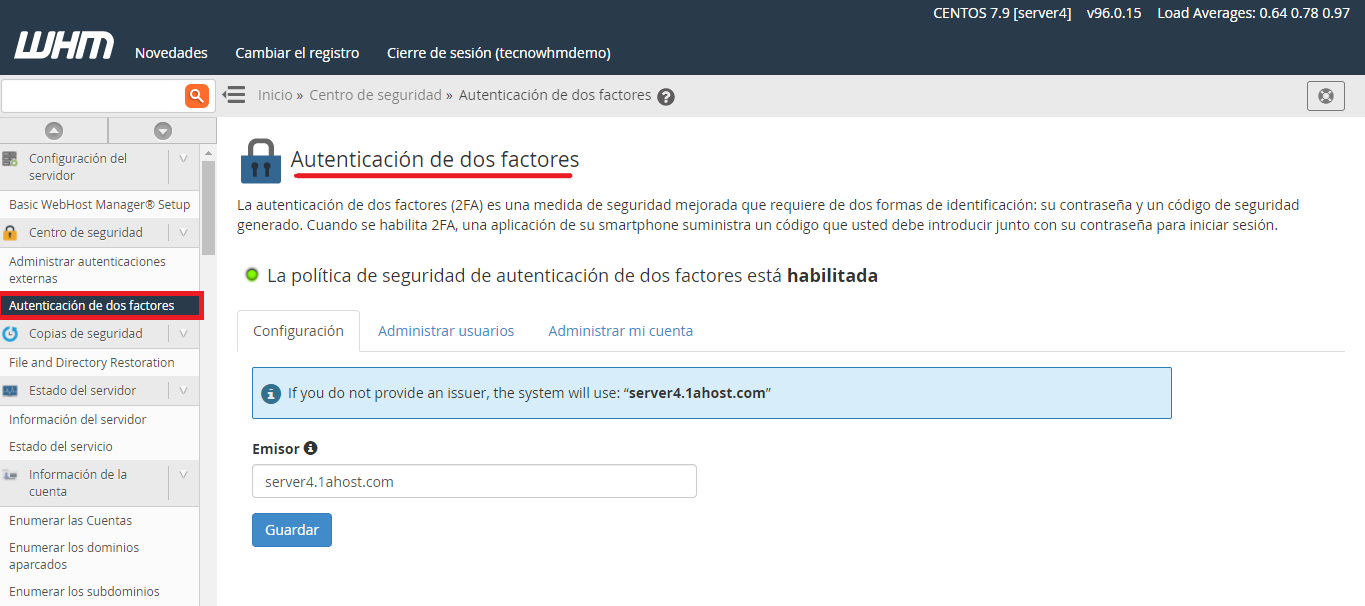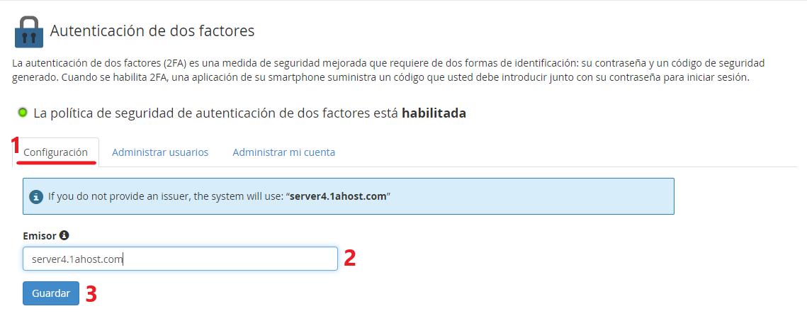 Para establecer la configuración del emisor para 2FA, realice los siguientes pasos: