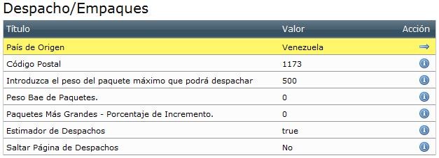 - Despachos / Empaques: Es donde se fija la información necesitada por la mayoría de los módulos de envío, se determinan datos como: ciudad de origen del envío, código postal de la misma, peso base de los paquetes, porcentaje adicional para paquetes más grandes, si se permiten envíos gratuitos, estimador de despachos, entre otros. Muy útil cuando se tienen conexiones / convenios con empresas especialistas en envíos.