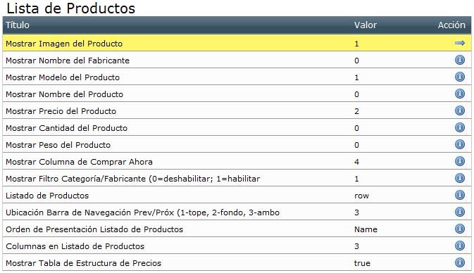 - Listado de Productos: Configura cómo se visualizará el listado de productos y qué información contendrá (si lleva imagen, nombre del fabricante, nombre del producto, precio, etc.). El orden (Valor) de la información de los productos se determina agregando números en secuencia, ej.: la opción con “1” se presentará primero, “2” en segundo lugar, el tercero con el “3”, etc. Para invalidar cualquier opción coloque “0”.