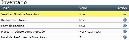 - Inventario / Existencia (Stock): Controla los parámetros relacionados con el nivel del inventario y cómo este afecta la comprobación de la Orden de Compra. Se puede definir: si se verifica o no la disponibilidad del producto, restar el producto al inventario por la cantidad vendida, permitir al cliente la compra aún ni no hay existencia, señalar al cliente en pantalla si es un producto con poca disponibilidad (Ej.: Agotado), o cuando se requiere un reordenamiento del sistema para la reposición del producto.