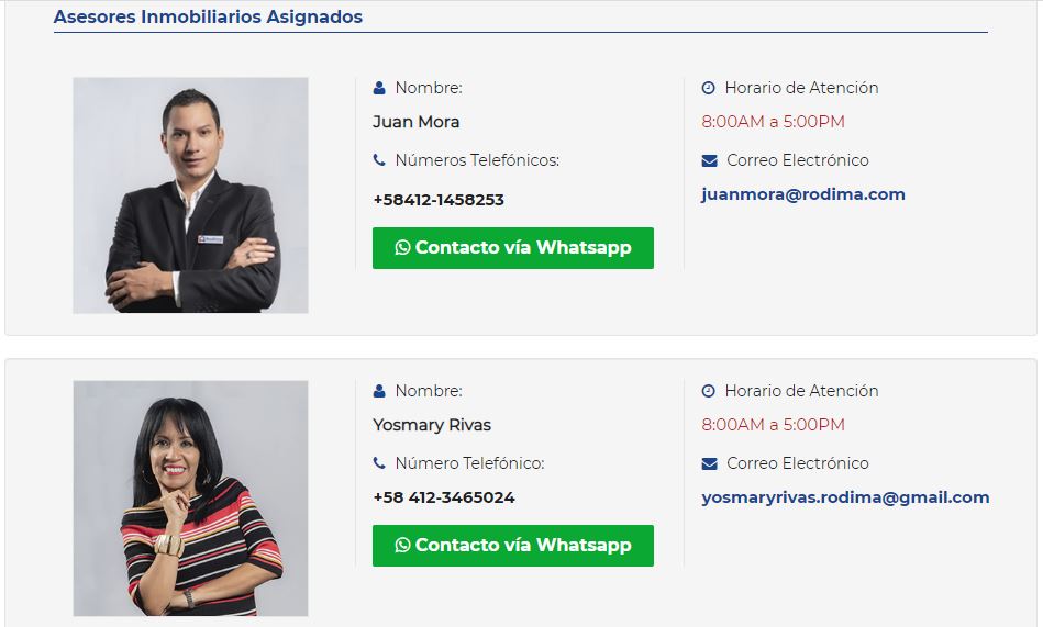 Asesores inmbiliarios: permite al usuario obtener datos directos del asesor de ventas que le asesorará y ampliará la información.