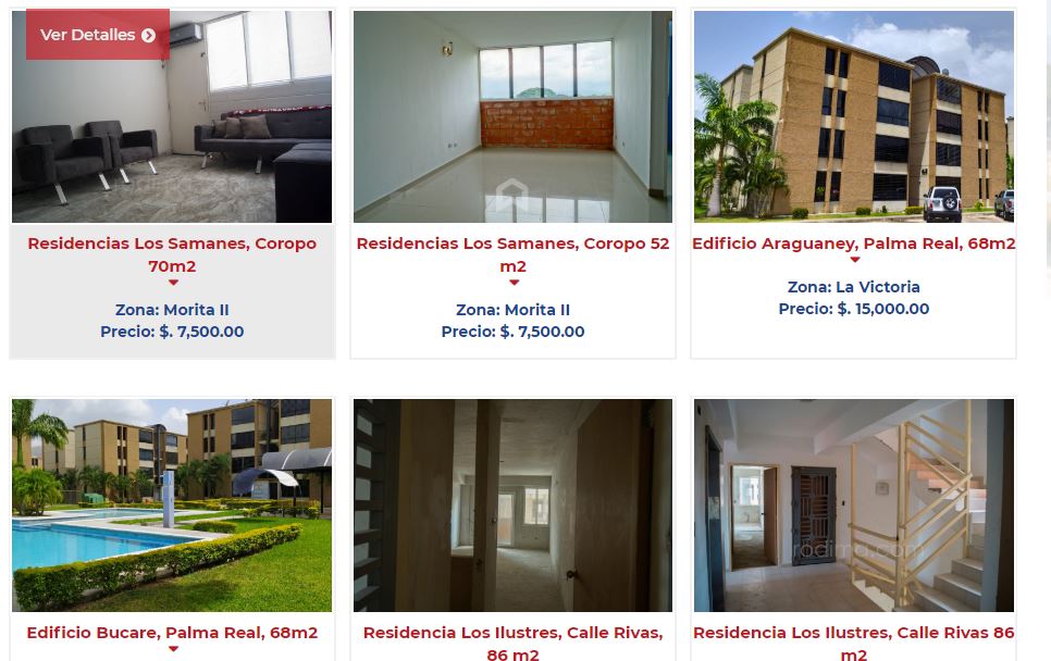 Este módulo del portal contiene todos los inmuebles clasificados previamente en su configuración como “Pre Venta”, “Mercado Secundario”. En su página principal y según la opción que escoja el cliente (Comprar o Alquilar), y según el tipo de inmueble, ejm: Apartamentos, Galpones, Casas, Locales. Muestra un listado inicial de los inmuebles registrados bajo esta categoría, cada uno con: nombre del proyecto, ubicación, metraje, fotografía, zona y precio, y un botón con la opción de Ver Detalles.