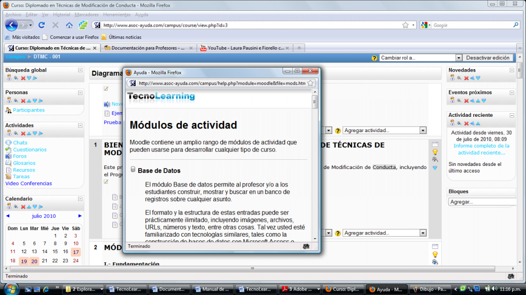 Una documentación breve que ofrece el programa, con el objeto de ofrecer información sobre puntos específicos, guiando al usuario; con el objeto de aclarar posibles dudas de uso de la plataforma de TecnoLearning. Ellas se ubican al lado de las ventanas de los bloques de información, actividades y recursos. Al hacer clic en éste icono, muestra la ayuda en una ventana emergente.