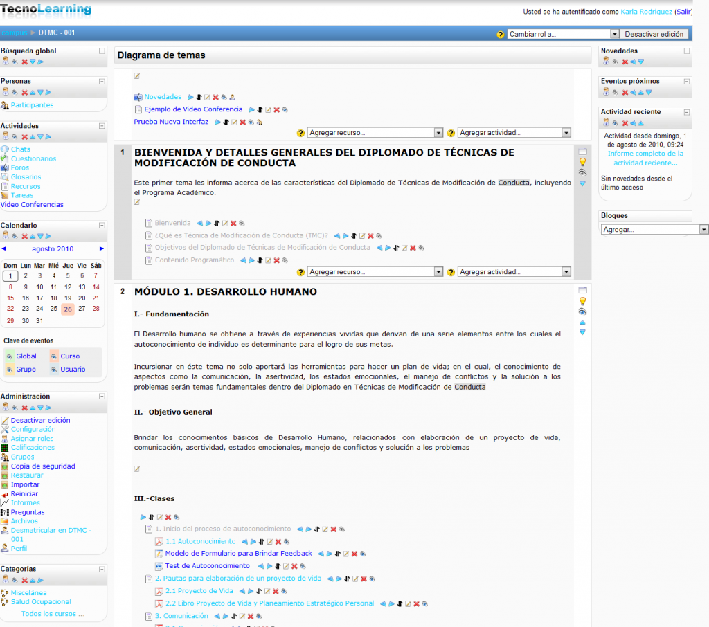 Veamos primero cuál es la estructura visual de la asignatura virtual, cómo están dispuestos los diferentes elementos y luego veremos cómo crearlos, cambiarlos o borrarlos.