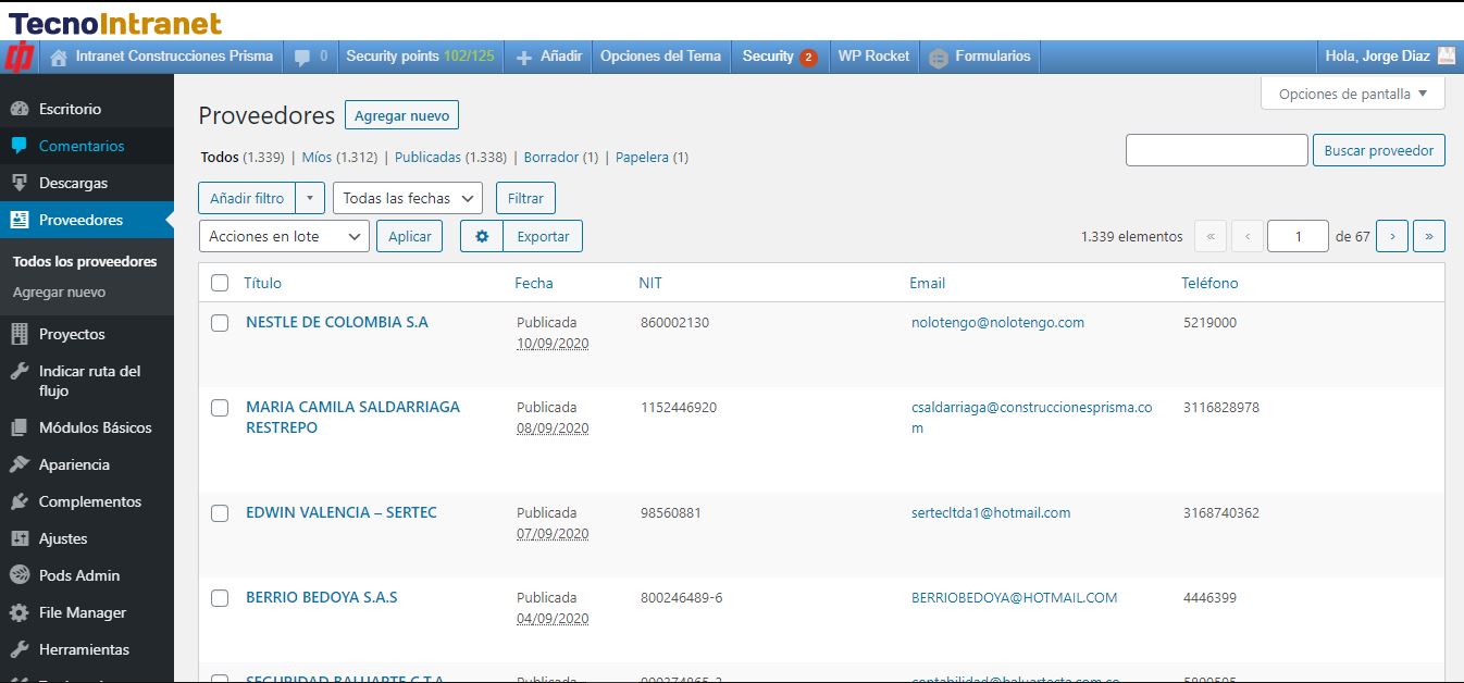 Para listar a los proveedores creados, solamente debemos darle clic a la opción Proveedores dentro del menú, esta lista mostrara los valores de cada proveedor que fueron configurados, los cuales son: Nombre del proveedor, fecha de creación, NIT, email y teléfono.